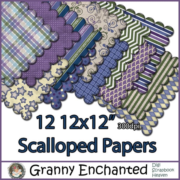 Digital Scrapbook Scalloped Papers 12x12" PNG files in Purple, blue, and Green Prints that include plaid, dot, star, paisley, scallop, stripe, and diamond patterns.